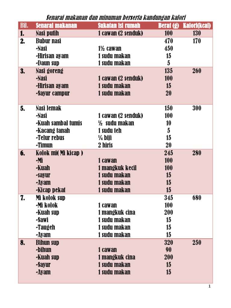 Senarai Makanan Dan Minuman Berserta Kandung Kalori
